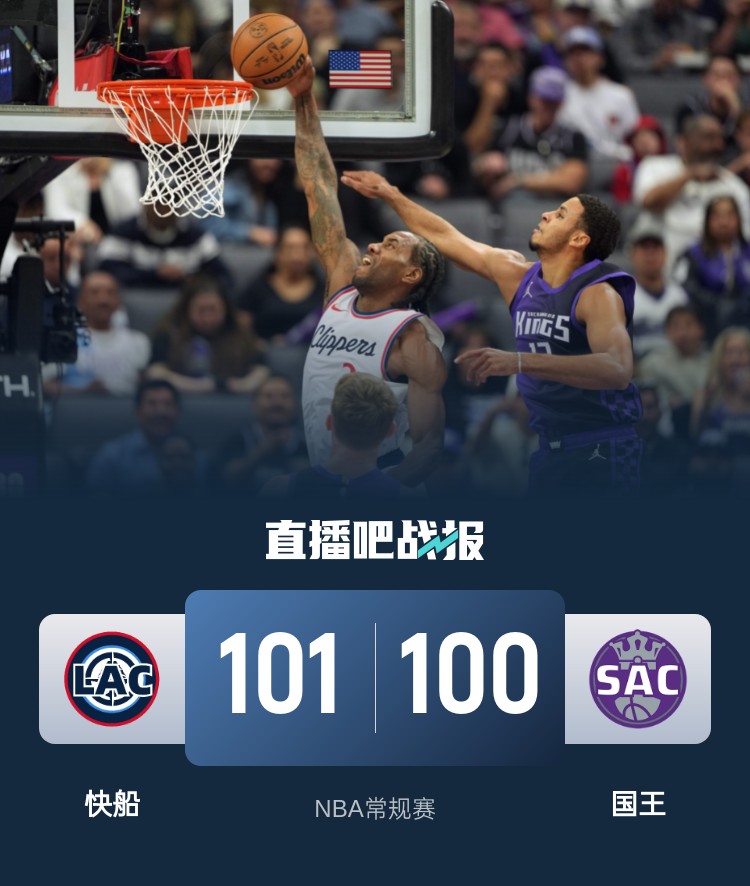 比赛开始,国王捍卫主场打出8-4开局,但快船迅速回应9-2反超比分,鲍威尔里突外投单节上双,但国王全民皆兵能回应首节领先5分,次节国王外线接连三分继续保持住领先,小卡各种中投连砍11分止血回应,半场前三分助快船反超1分。第三节,双方防守强度都不小,各种挑战,哈登带队连续打反击扩大领先,但小萨博尼斯能中投回应,瓦兰连续强打追到差5分,末节国王始终能咬住比分,哈登造杀伤后小琼斯抢断反击助快船领先到9分,随后双方都犯满,拉文连续两记三分后德罗赞中投追到差2分,快船连续前场篮板,哈登再两罚一中后关键发球失误,但德罗赞绝杀三分不中,最终快船101-100险胜国王,拿到7连胜。