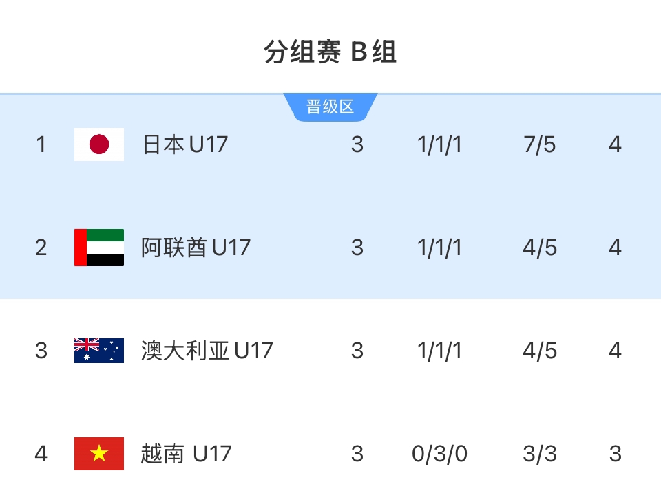 04月11日讯 U17亚洲杯B组末轮战罢,越南1-1阿联酋,日本2-3澳大利亚。日本和阿联酋最终小组出线,但本组的晋级局势比赛中多次反转。