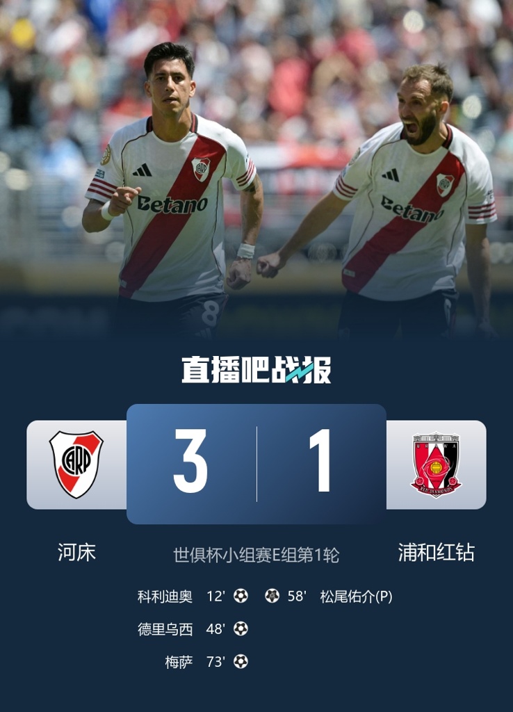 6月18日讯 世俱杯小组赛E组第1轮,河床对阵浦和红钻,比赛在西雅图流明球场进行。上半场,科利迪奥破门,古斯塔夫松进球被吹。易边再战,德里乌西破门后伤退,松尾佑介点射扳回一球,梅萨再下一城。最终河床3-1浦和红钻。